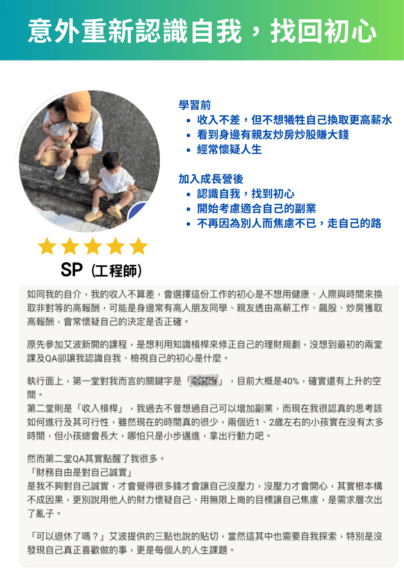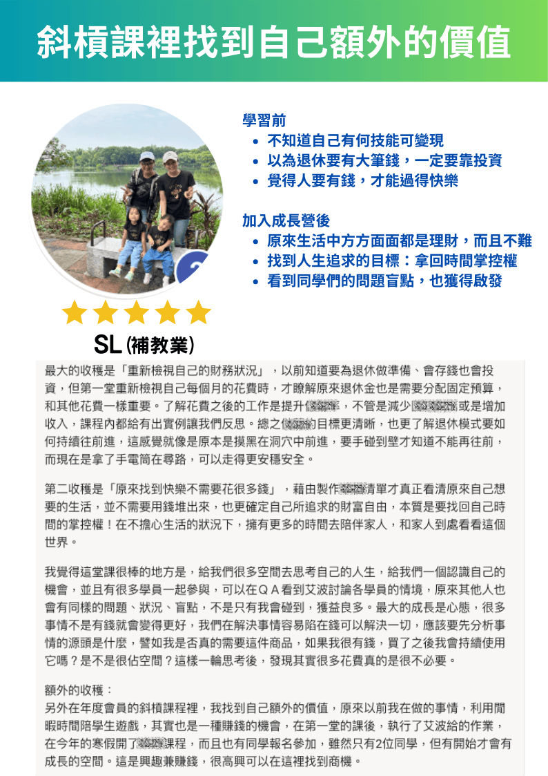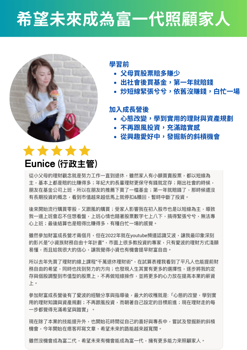 我希望可以幫助你在財務上成功,獲得理想中的收入,進而有能力給家人更好的生活品質,未來也有機會實現自己因為錢的關係,而一直未能實現的夢想!
