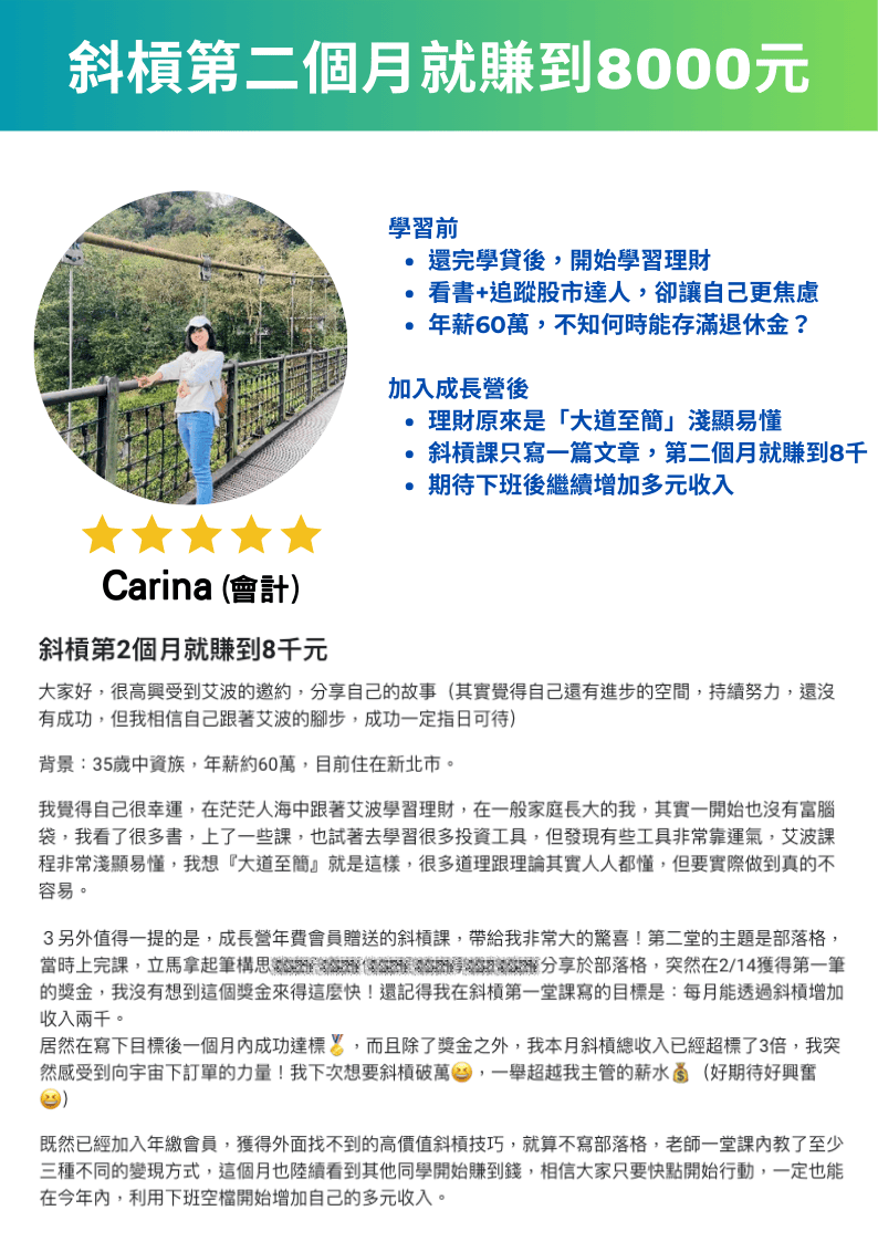 大家視自身財力,勿勉強。 我會推薦大家花一年給自己新的挑戰。年費會員獨家贈送的「斜槓煉金術」,是我從來沒公開過的賺錢秘訣。